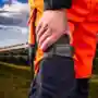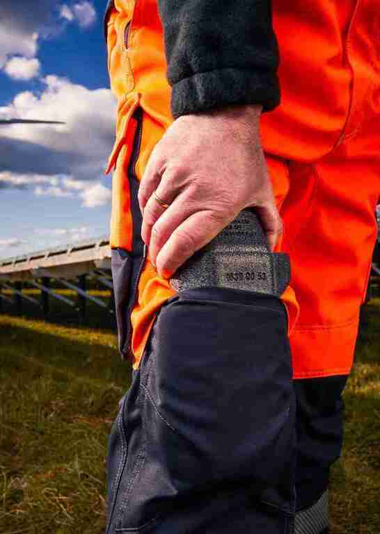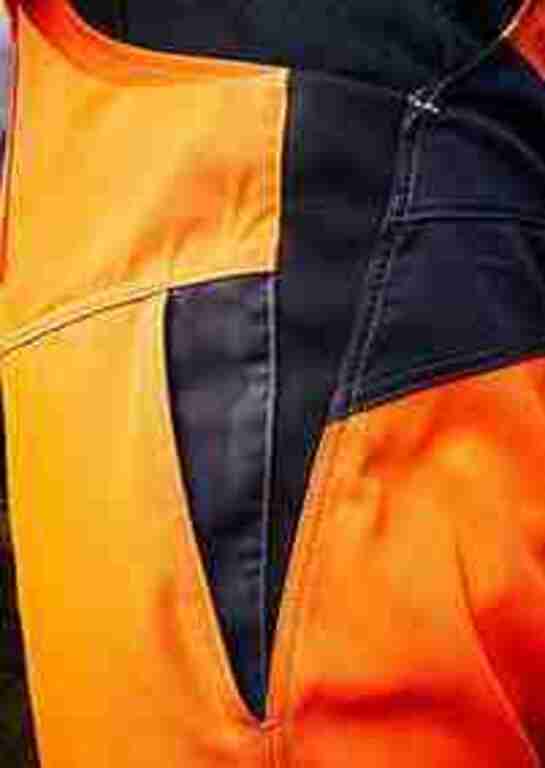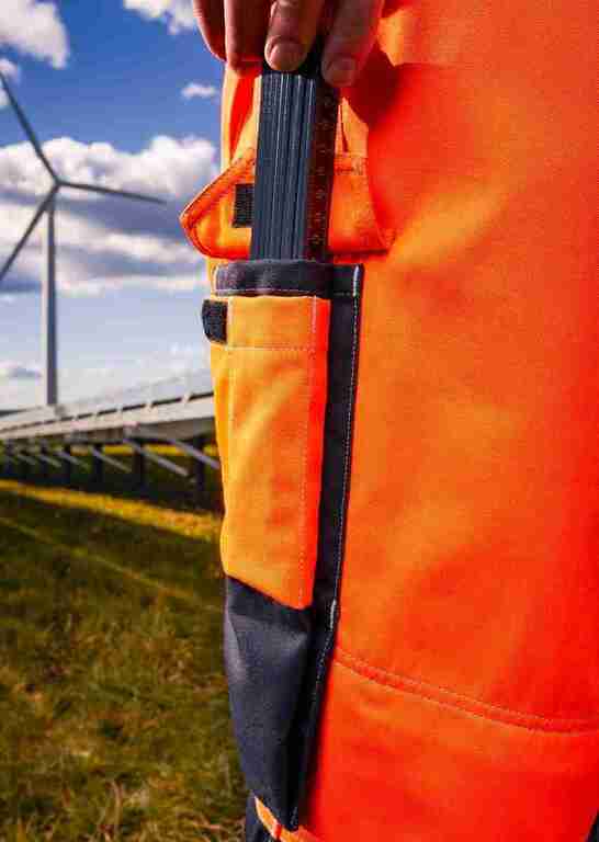 Stretchträger mit Kunststoff-Steckschnallen, doppelte Latztasche mit Reißverschluss und Taschenklappe, hochgezogener Rücken, ergonomischer Schnitt, 2 Seitentaschen, 1 mit Patte verschließbare Gesäßtasche, 1 geräumige Schenkeltasche mit aufgesetzter Smartphonetasche, freihängende Zollstocktasche mit Stifttaschen, je 2 umlaufende Reflexstreifen (7 cm) auf dem unteren Bein, vorgeformtes Bein, Kniepolstertaschen (Kniepolster 1839 bitte separat bestellen)