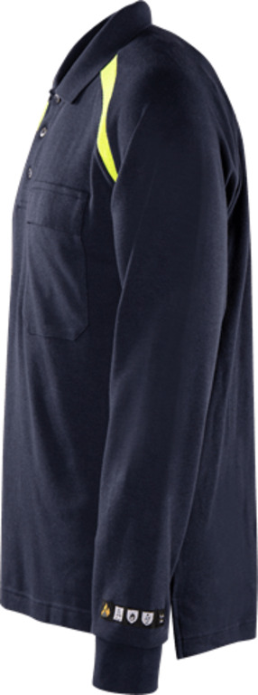 3er-Knopfleiste / Rippstrickkragen / Brusttasche / Elastische Bündchen an Armabschlüssen / Seitenschlitze / Geprüft und zugelassen gemäß EN 61482-1-2 APC 1, EN 61482-1-1 EBT: 6,2 cal/cm² ELIM: 4,4 cal/cm² (siehe Lichtbogentabelle für zertifizierte Bekleidungskombinationen für EN 61482-1-2 Klasse 2 und offenen Lichtbogen nach EN 61482-1-1), EN ISO 11612 A1 B1 C1 F1 und EN 1149-5 / OEKO-TEX® zertifiziert. Größen: XS - 4XL Normen: OEKO-TEX® Klassifikationen: IEC 61482-2 Störlichtbogen, mit ELIM-Wert.|EN ISO 11612 Schutz vor Hitze und Flammen|EN 1149 Schutz vor elektrostatischer Entladung Eigenschaften: Multinorm|Inhärenter Flammschutz|Hoher Tragekomfort description (en): 3-button placket / Chest pocket / Approved according to EN 61482-1-2 APC 1, EN 61482-1-1 ELIM: 4,4 cal/cm² EBT: 6,2 cal/cm², (see Electric arc table for certified garment combinations for EN 61482-1-2 class 2 and open arc according to EN 61482-1-1), EN ISO 11612 A1 B1 C1 F1 and EN 1149-5 / OEKO-TEX® certified.