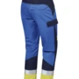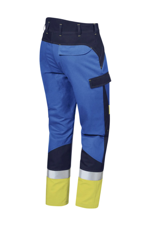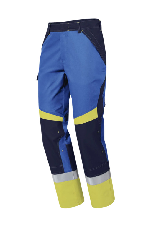Dreifarbig, erhöhter Rückenbund, verdeckter Patentknopf, Druckknöpfe im Schlitz, seitliche Eingrifftaschen mit Blende und verdecktem Druckkopf, Pattentasche auf linkem Oberschenkel und rechter doppelter Zollstocktasche mit Patte und verdeckten Druckknöpfen, innenliegende Knietaschen mit Kontrasteinsatz oberhalb der rechten und linken Knietasche und kontrastfarbiger Beinabschluss als Erkennungsmerkmal der Sicherheitsstufe „heavy+“, Reflexstreifen unterhalb der Knietaschen, rechte Gesäßtasche mit Patte und verdecktem Druckknopf, 8 Gürtelschlaufen, Vorderhose zweilagig.