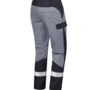 Dreifarbig, erhöhter Rückenbund, verdeckter Patentknopf, Druckknöpfe im Schlitz, seitliche Eingrifftaschen mit Blende und verdecktem Druckkopf, Pattentasche auf linkem Oberschenkel und rechter doppelter Zollstocktasche mit Patte und verdeckten Druckknöpfen, innenliegende Knietaschen mit Kontrasteinsatz oberhalb der rechten und linken Knietasche als Erkennungsmerkmal der Sicherheitsstufe „heavy“, Reflexstreifen unterhalb der Knietaschen, rechte Gesäßtasche mit Patte und verdecktem Druckknopf, 8 Gürtelschlaufen.