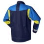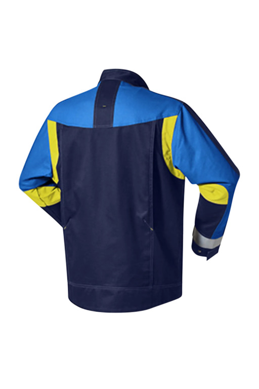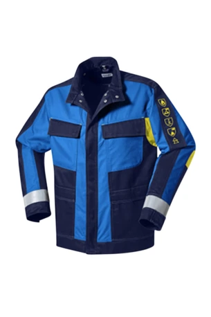 Dreifarbig, Stehkragen, verdeckte Knopfleiste, Brusttaschen mit Patten und verdeckten Druckknöpfen, Fronttaschen mit Blende und verdecktem Druckknopf, verlängerter Rücken, Piktogramm-Einstickung auf linkem Oberarm, Kontrastdetails auf Ellenbogenhöhe und zusätzlich am Armloch als Erkennungsmerkmal der Sicherheitsstufe „heavy“, Ärmelsaum mit Reflexstreifen und Druckknöpfen zur Weitenregulierung, Bewegungsfalten im Rücken.