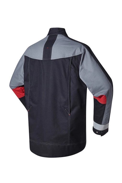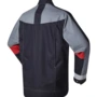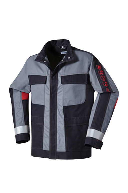 Dreifarbig, Stehkragen, verdeckte Knopfleiste, Brusttaschen mit Patten und verdeckten Druckknöpfen, Fronttaschen mit Blende und verdecktem Druckknopf, verlängerter Rücken, Piktogramm-Einstickung auf linkem Oberarm, Kontrastdetails auf Ellenbogenhöhe als Erkennungsmerkmal der Sicherheitsstufe „light“, Ärmelsaum mit Reflexstreifen und Druckknöpfen zur Weitenregulierung, Bewegungsfalten im Rücken.