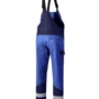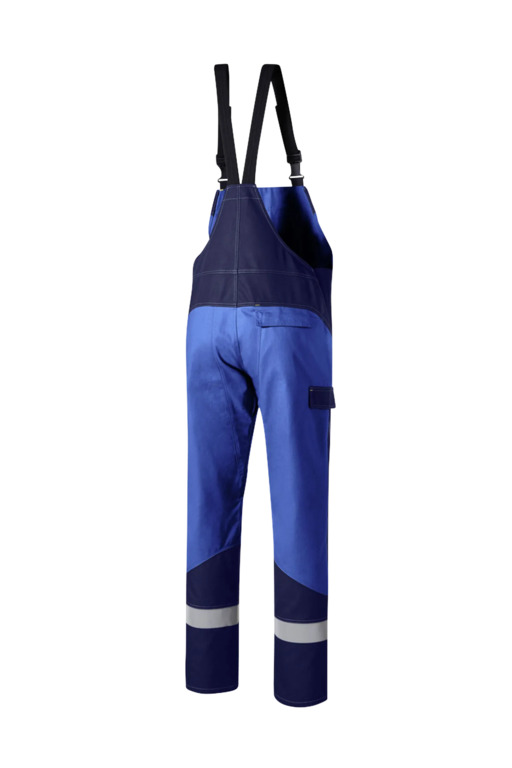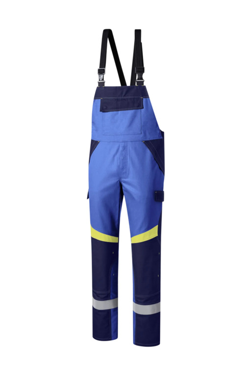 Dreifarbig, seitliche Stretcheinsätze, Druckknöpfe im Schlitz, verstellbaren Stretchträger mit Fixlockschnallen, Latztasche mit Patte und verdeckten Druckknöpfen, seitliche Eingrifftaschen mit Blende und verdecktem Druckkopf, Pattentasche auf linkem Oberschenkel und rechte doppelte Zollstocktasche mit Patte und verdeckten Druckknöpfen, innenliegende Knietaschen mit Kontrasteinsatz oberhalb der rechten und linken Knietasche als Erkennungsmerkmal der Sicherheitsstufe „heavy“, Reflexstreifen unterhalb der Knietaschen, rechte Gesäßtasche mit Patte und verdecktem Druckknopf.