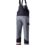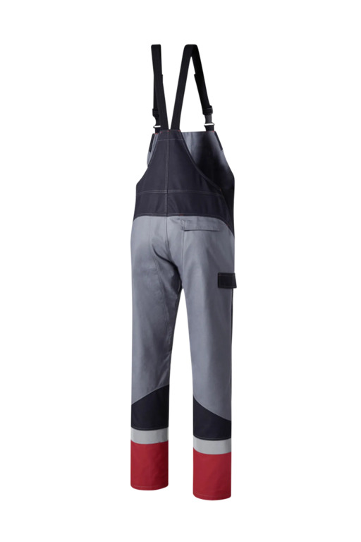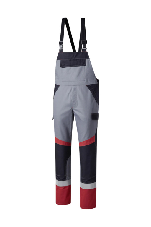 Dreifarbig, seitliche Stretcheinsätze, Druckknöpfe im Schlitz, verstellbaren Stretchträger mit Fixlockschnallen, Latztasche mit Patte und verdeckten Druckknöpfen, seitliche Eingrifftaschen mit Blende und verdecktem Druckkopf, Pattentasche auf linkem Oberschenkel und rechte doppelte Zollstocktasche mit Patte und verdeckten Druckknöpfen, innenliegende Knietaschen mit Kontrasteinsatz oberhalb der rechten und linken Knietasche und kontrastfarbiger Beinabschluss als Erkennungsmerkmal der Sicherheitsstufe „heavy+“, Reflexstreifen unterhalb der Knietasche, rechte Gesäßtasche mit Patte und verdecktem Druckknopf, Vorderhose zweilagig.