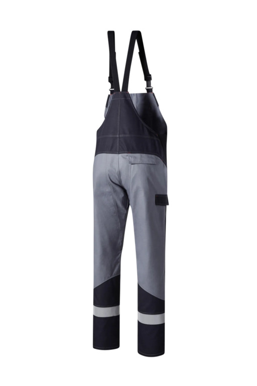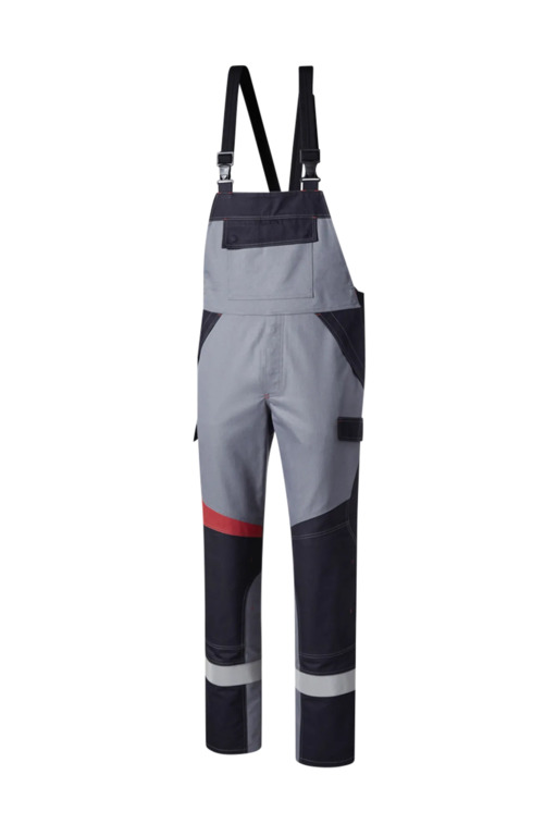 Dreifarbig, seitliche Stretcheinsätze, Druckknöpfe im Schlitz, verstellbaren Stretchträger mit Fixlockschnallen, Latztasche mit Patte und verdeckten Druckknöpfen, seitliche Eingrifftaschen mit Blende und verdecktem Druckkopf, Pattentasche auf linkem Oberschenkel und rechte doppelte Zollstocktasche mit Patte und verdeckten Druckknöpfen, innenliegende Knietaschen mit Kontrasteinsatz oberhalb der rechten Knietasche als Erkennungsmerkmal der Sicherheitsstufe „light“, Reflexstreifen unterhalb der Knietaschen, rechte Gesäßtasche mit Patte und verdecktem Druckknopf.