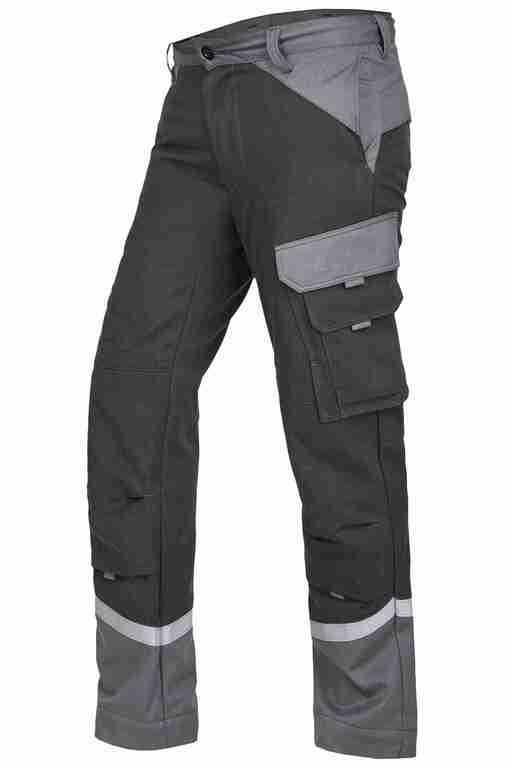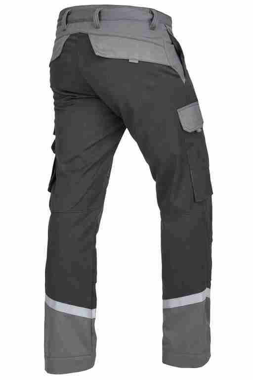Bund mit Gürtelschlaufen und Knopf, Schlitz mit Reißverschluss, 2 Seitentaschen, links Cargotasche mit aufgesetzter Smartphonetasche jeweils mit Patte und Druckknöpfen, rechts Zollstocktasche mit Patte und Druckknopf, Knietaschen, Gesäßtaschen mit Patte und Druckknöpfen, einfache Hosenbeinverlängerung durch skandinavischen Saum, Reflexstreifen um Beine, Vorderteil zweilagig. .