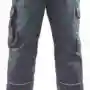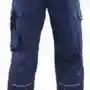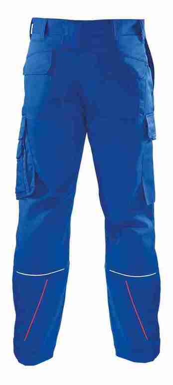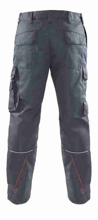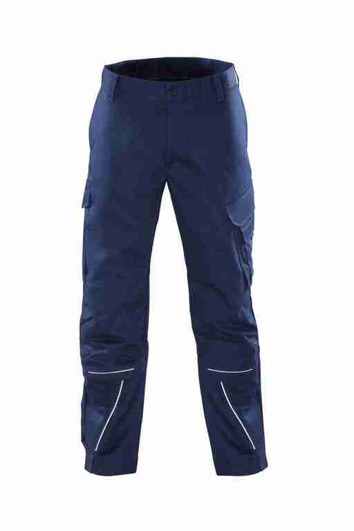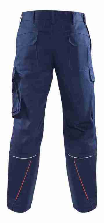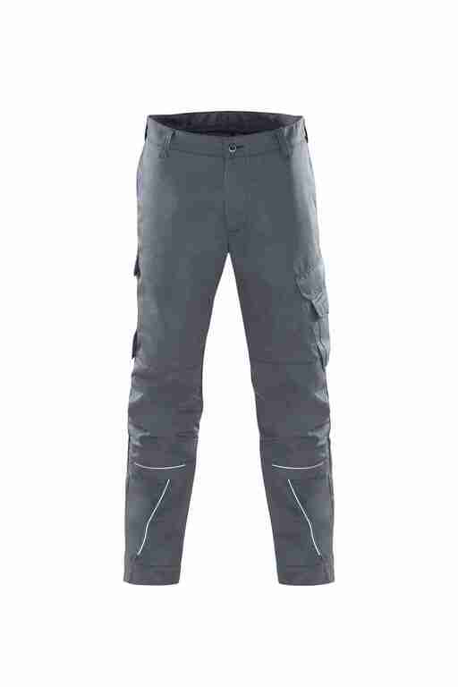 Bund mit Gürtelschlaufen und Knopf, Schlitz mit Reißverschluss, 2 Seitentaschen, links Cargotasche mit aufgesetzter Smartphonetasche jeweils mit Patte und Druckknöpfen, rechts Zollstocktasche mit Patte und Druckknopf, Knietaschen, 2 Gesäßtaschen mit Patte und Druckknöpfen, einfache Hosenbeinverlängerung durch skandinavischen Saum, Reflexpaspel an Beinen, leuchtfarbende Kontrastpaspel an Hinterhose.