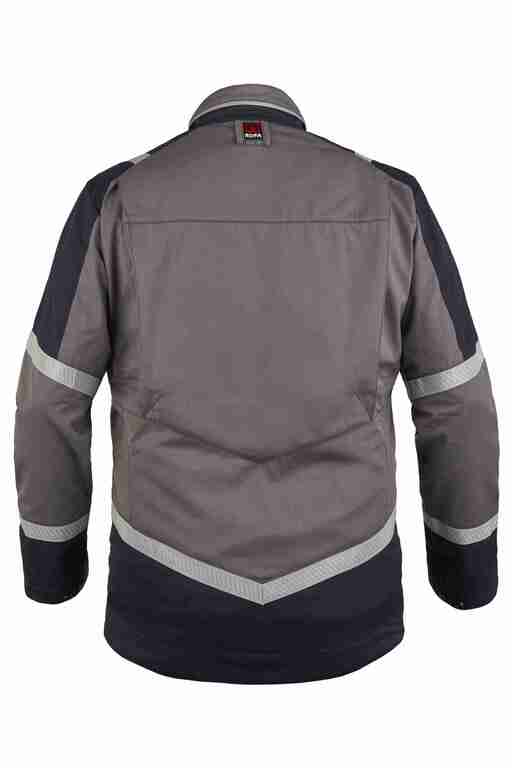 Stehkragen ? vordere Mitte mit Reißverschluss und Druckknöpfen ? Kragen mit Klett ? 2 Brusttaschen mit Reißverschluss? Ärmelabschluss weitenverstellbar durch Druckknöpfe ? 2 Seitentaschen mit Reißverschluss? Bewegungsfalten im Rückenteil ? verlängerter Rücken ?2 Innentaschen mit Klett ? Kunststoffdruckknöpfe ? 25 mm Reflexstreifen um Rumpf, Ärmel und über Schulter ? Reflexpaspel am Kragen.