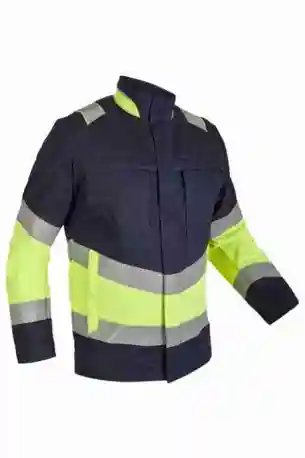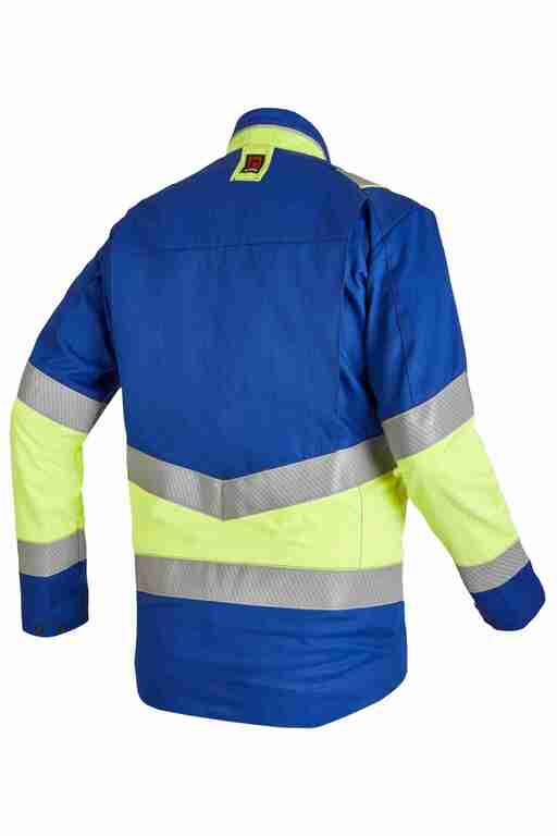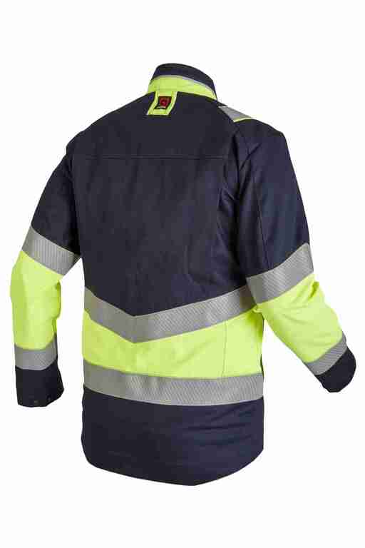 Stehkragen ? vordere Mitte mit Reißverschluss und Druckknöpfen ? 2 vertikale Brusttaschen mit Reißverschluss ? Ärmelabschluss weitenverstellbar durch Druckknopf ? 2 Seitentaschen mit Reißverschluss ? Bewegungsfalten im Rückenteil ? verlängerter Rücken ? 2 große Innentaschen ? 50mm Reflexstreifen um Rumpf ? Ärmel und über Schulter ? Reflexpaspel am Kragen. Anwendungsgebiete:bei Energieversorgern, im Niederspannungsbereich, wie bspw. Hausanschlusskästen, Ortsnetzstationen, für Arbeiten von unter Spannung stehenden Teilen, Gasversorgungsbetrieben, pyrotechnische Industrie, in der Chemieindustrie, oder in anderen, explosionsgefährdeten Bereichen, bei Verkehrsbetrieben, für leichte Schweißarbeiten, Industriearbeiterbekleidung.
