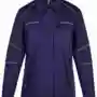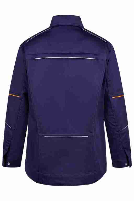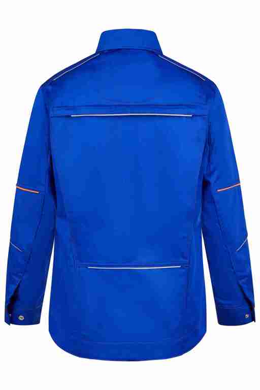 Umlegekragen, vordere Mitte mit Druckknöpfen, 2 Brusttaschen mit Patte und Druckknopf, Ärmelabschluss weitenverstellbar durch Druckknöpfe, 2 Seitentaschen mit Patte und Druckknopf, Bewegungsfalten im Rückenteil, links Brustinnentaschen mit Klett, zusätzlich 2 große Innentaschen, Reflexpaspel an Vorder-, Rückenteil, Schultern und Ärmeln, leuchtfarbende Kontrastpaspel an Ärmeln, Vorderteil und Ärmel zweilagig.