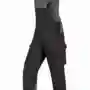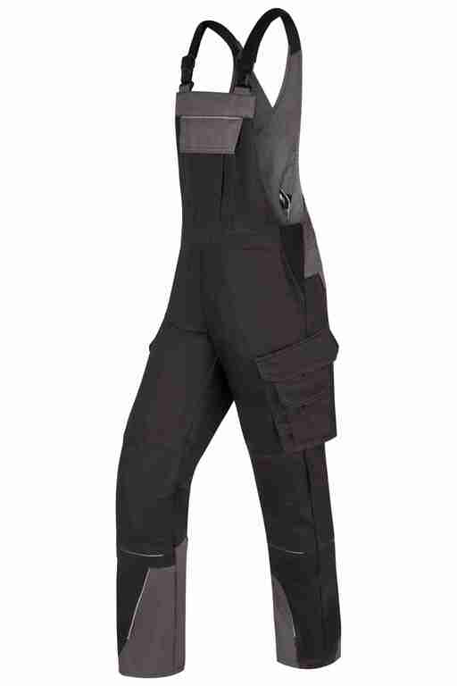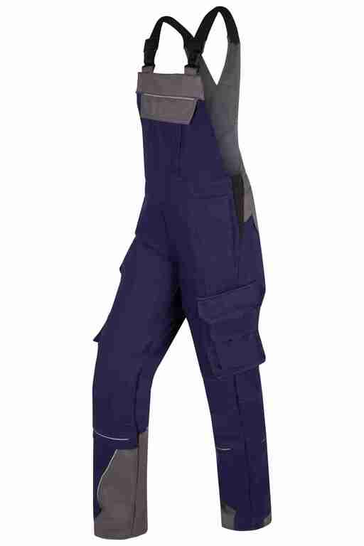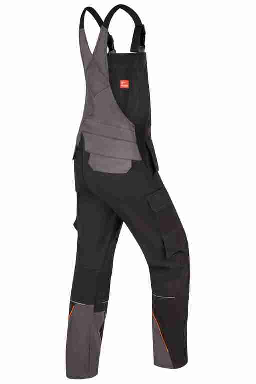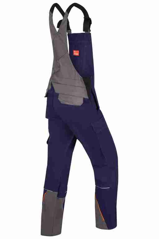 Stretchträger, Latztasche mit Patte und Druckknöpfen, Bund seitlich mit Dehneinsatz, 2 Seitentaschen, links Cargotasche mit aufgesetzter Smartphonetasche jeweils mit Patte und Druckknöpfen, rechts Zollstocktasche mit Patte und Druckknopf, Knietaschen, 2 Gesäßtaschen mit Patte und Druckknöpfen, einfache Hosenbeinverlängerung durch skandinavischen Saum, Reflexpaspel an Latz und Hosenbeinen, leuchtfarbende Kontrastpaspel an Hinterhose.