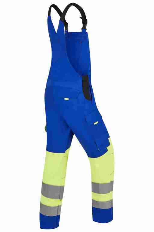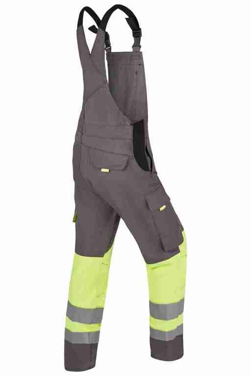 Stretchträger, Latztasche mit Patte und Druckknöpfen, Bund seitlich mit Dehneinsatz, 2 Seitentaschen, links Cargotasche mit aufgesetzter Smartphonetasche jeweils mit Patte und Druckknöpfen, rechts Zollstocktasche mit Patte und Druckknopf, Knietaschen, 1 Gesäßtasche rechts mit Patte und Druckknöpfen, einfache Hosenbeinverlängerung durch skandinavischen Saum, 50 und 70mm Reflexstreifen um Beine.