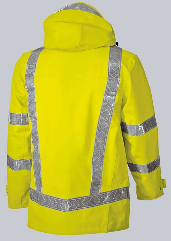 Stehkragen, abknöpfbare Kapuze mit doppelter Weitenregulierung, wasserdichter Frontreißverschluss mit doppelte Druckknopfleiste, verschweißte Nähte, 2 Seitentaschen mit Druckknopf verschließbar, 1 Napoleontasche mit Reißverschluss, 2 Brusttaschen mit Klettverschluss verschließbar, ergonomisch geformter Ärmel, Armliftsystem für mehr Bewegungsfreiheit, verstellbarer Ärmelabschluss, 1 Innentasche, große Reparaturöffnung, innenliegende Saumweitenverstellung, je 2 Reflexstreifen auf dem Ärmel, 1 umlaufender Reflexstreifen oberhalb des Saumes, je 2 umlaufende vertikale Reflexstreifen vorn und hinten, kombinierbar mit wärmender Fleecejacke 1872 und 2025 Reflexstreifen für 360° Sichtbarkeit abnehmbare Kapuze kombinierbar mit wärmender Fleecejacke BP 1872 und BP 2025 normale Passform EN 343 Wetterschutz Wasserdicht Kl. 4, atmungsaktiv Kl. 4, X, EN 14058 Schutz bei kühlen Umgebungen, Kl. 1 3 x WP in Verbindung mit Fleecejacke 2025-628 & 1872-646, EN ISO 20471 Warnschutz Klasse 3,