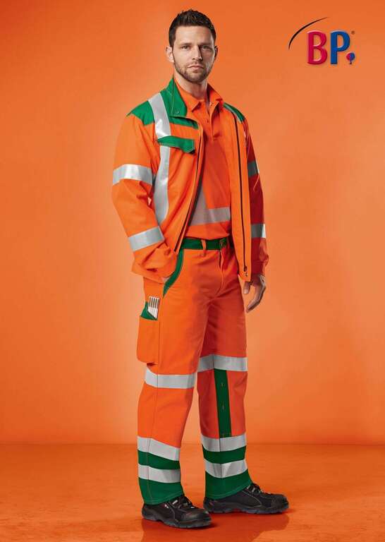 Rückwärtiger Dehnbund für optimalen Sitz, 2 Seitentaschen, Schenkeltasche mit aufgesetzter Smartphone- und Stifttasche, Schenkel- und Smartphonetasche mit Patte verschließbar, freihängende doppelte Zollstocktasche, 1 mit Patte verschließbare Gesäßtasche, je 2 umlaufende Reflexstreifen auf dem unteren Bein, je 1 umlaufender Reflexstreifen auf dem oberen Bein, Knieeinschubtaschen für Kniepolster 1839 000 53 (bitte separat bestellen) integrierter UV Schutz nach Standard 801 hoher Tragekomfort durch innenliegende Baumwolle schmutzabweisend durch DuraClean Ausrüstung normale Passform EN ISO 20471 Warnschutz Klasse 2, EN 14404 Knieschutz in Verbindung mit BP® Kniepolster 1839-000-53,