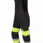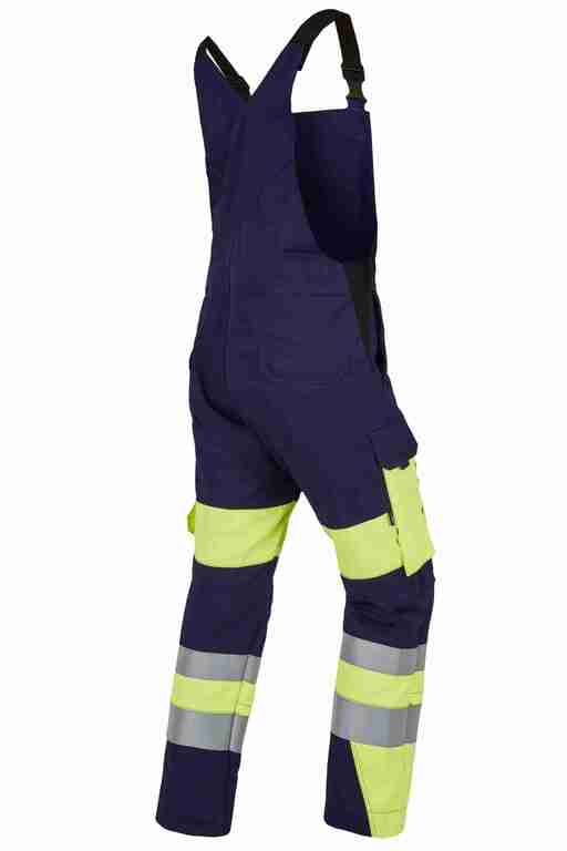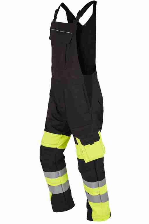 Stretchträger, Latztasche mit Patte und Druckknöpfen, Schlitz mit Reißverschluss, Bund seitlich mit Dehneinsatz, 2 Seitentaschen, links Cargotasche mit aufgesetzter Smartphonetasche jeweils mit Patte und Druckknöpfen, rechts Zollstocktasche mit Patte und Druckknopf, Knietaschen, Gesäßtaschen mit Patte und Druckknöpfen, einfache Hosenbeinverlängerung durch skandinavischen Saum, 50mm und 70mm Reflexstreifen um Beine, Reflexpaspel an Latz.