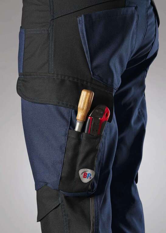 Erhöhter Dehnbund im Rücken für optimalen Sitz, D-Ring zum Befestigen von Accessoires, 2 Seitentaschen, 2 Gesäßtaschen, davon 1 Tasche mit Patte verschließbar, 1 geräumige Schenkeltasche mit integrierter Reißverschlusstasche und aufgesetzter Smartphonetasche, 2 Stifttaschen, doppelte Zollstocktasche, ergonomischer Schnitt, Reflexelemente am Bein, Kniepolstertaschen aus Cordura® (BP® Kniepolster 1839-000-53 bitte separat bestellen) hergestellt mit Polyester aus recycelten PET Flaschen erhöhter Bund für optimalen Sitz Kniepolstertaschen schmale Passform EN 14404 Knieschutz in Verbindung mit BP® Kniepolster 1839-000-53,