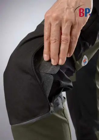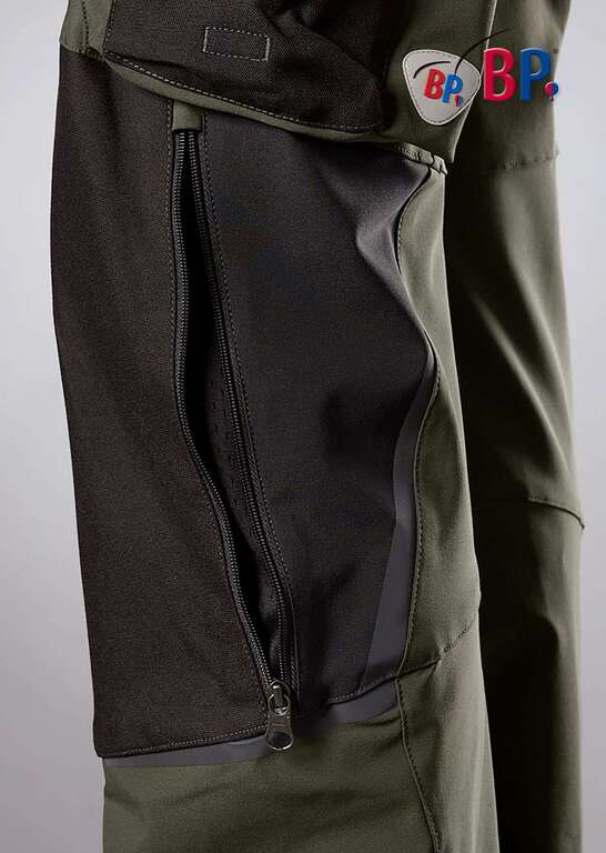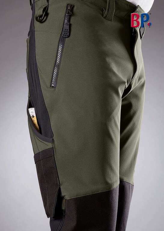 Schlanke Silhouette, ergonomischer Schnitt, erhöhter Dehnbund im Rücken für optimalen Sitz, 2 Seitentaschen mit Reißverschluss, 2 Gesäßtaschen, 1 geräumige Schenkeltasche mit Reißverschluss und aufgesetzter Smartphonetasche, D-Ring zum Befestigen von Accessoires, freihängende doppelte Zollstocktasche, vorgeformtes Bein, Reflexelemente in Dunkelgrau am Bein, Kniepolstertaschen aus Cordura® mit Reißverschluss und Belüftungsöffnung (BP® Kniepolster 1839-000-53 bitte separat bestellen) vollelastisches Material für maximale Bewegungsfreiheit besonders leicht, atmungsaktiv und schnell trocknend Reflexelemente in Dunkelgrau schlanke Passform
