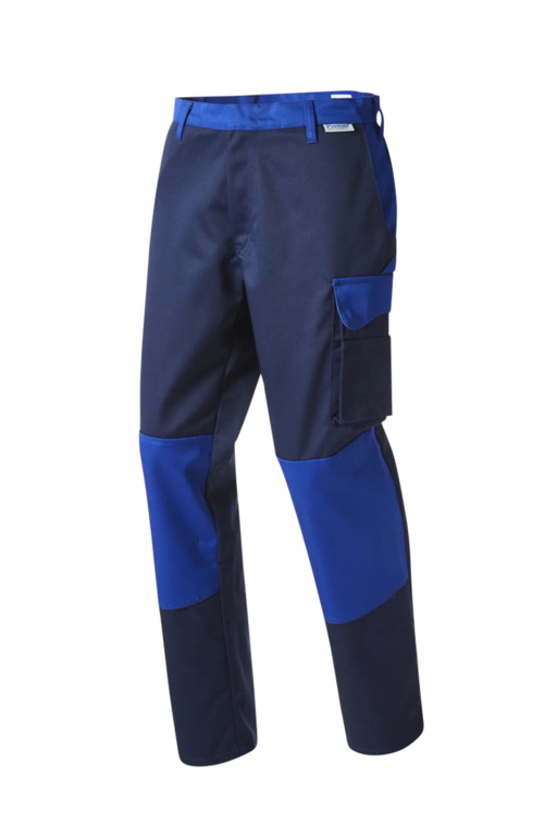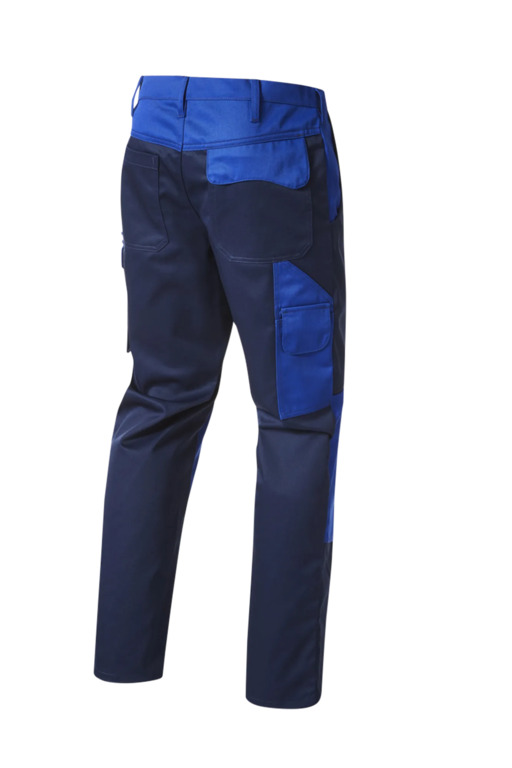 Zweifarbige Bundhose mit zwei Seitentaschen, Knietaschen, Schenkeltaschen mit aufgesetzter 4-facher Stifttasche links, Zollstocktasche mit aufgesetzter Handytasche mit farblich abgesetzter Patte und Klettverschluss rechts, zwei Gesäßtaschen, rechts mit farblich abgesetzter Patte und Druckverschluss, Hammerschlaufe, Schlitz mit Reißverschluss