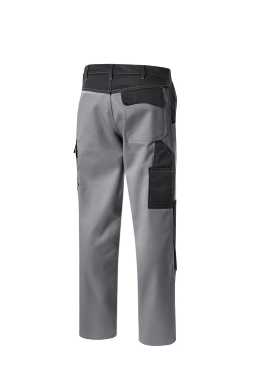 Zweifarbige Bundhose mit zwei Seitentaschen, Knietaschen, Schenkeltaschen mit aufgesetzter 4-facher Stifttasche links, Zollstocktasche mit aufgesetzter Handytasche mit farblich abgesetzter Patte und Klettverschluss rechts, zwei Gesäßtaschen, rechts mit farblich abgesetzter Patte und Druckverschluss, Hammerschlaufe, Schlitz mit Reißverschluss