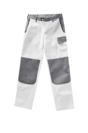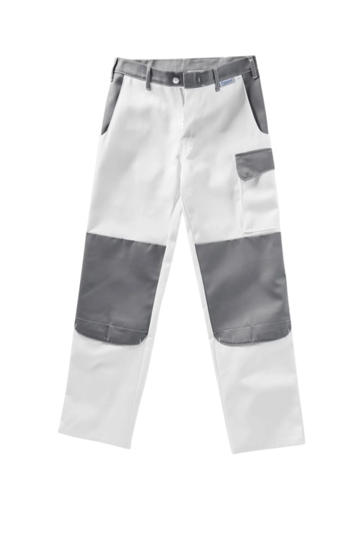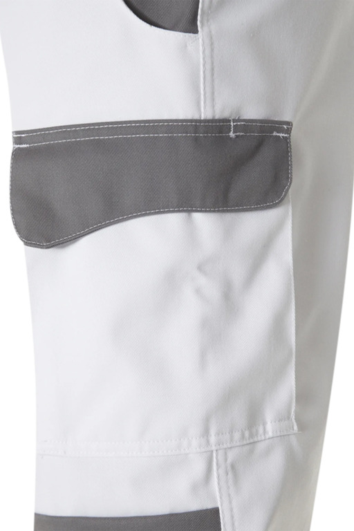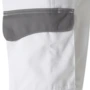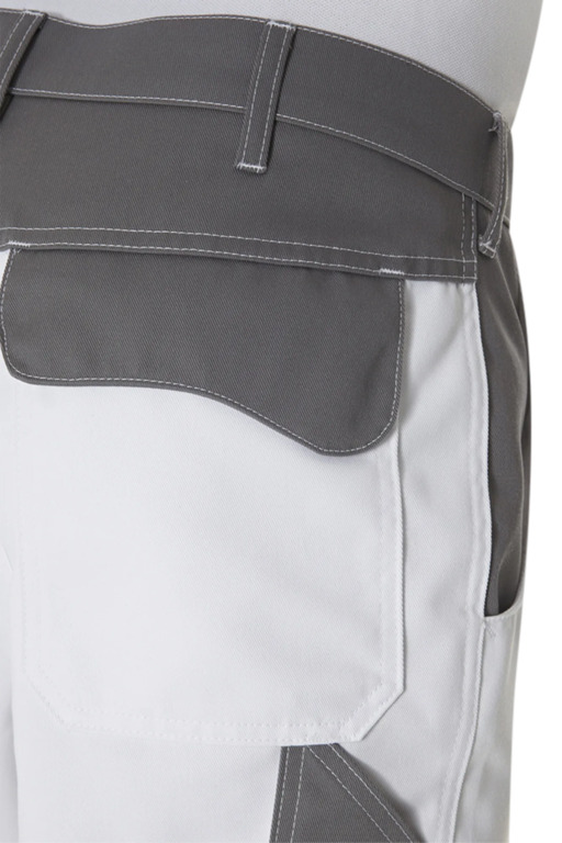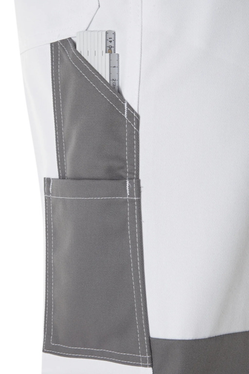 Zweifarbige Bundhose mit zwei Seitentaschen, Knietaschen, Schenkeltaschen mit aufgesetzter 4-facher Stifttasche links, Zollstocktasche mit aufgesetzter Handytasche mit farblich abgesetzter Patte und Klettverschluss rechts, zwei Gesäßtaschen, rechts mit farblich abgesetzter Patte und Druckverschluss, Hammerschlaufe, Schlitz mit Reißverschluss