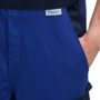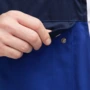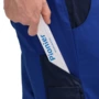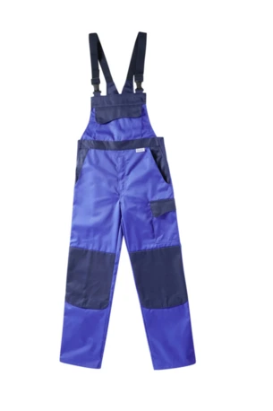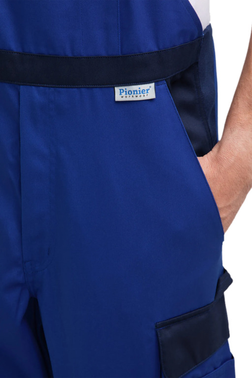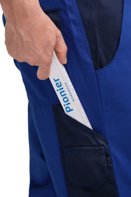 Zweifarbige Latzhose mit hochgezogenem Rücken, elastische Träger mit Fixlockschnalle, Latztaschen mit farblich abgesetzter Patte und Druckverschluss, zwei seitliche Stretchkeile, zwei Seitentaschen, Knietaschen, Schenkeltasche mit aufgesetzter fünf-facher Stifttasche links, Zollstocktasche mit aufgesetzter Handytasche mit farblich abgesetzter Patte und Klettverschluss rechts, zwei Gesäßtaschen, rechts mit farblich abgesetzter Patte und Druckverschluss, Hammerschlaufe, Schlitz mit Reißverschluss