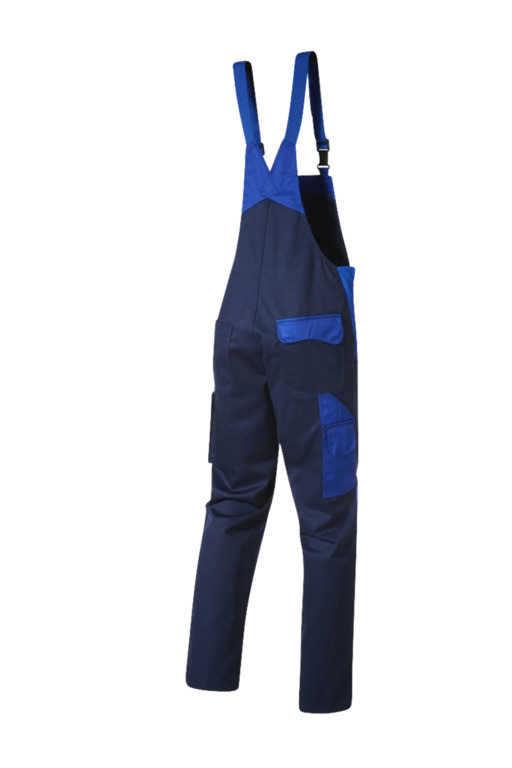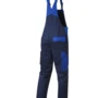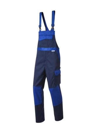 Zweifarbige Latzhose mit hochgezogenem Rücken, elastische Träger mit Fixlockschnalle, Latztaschen mit farblich abgesetzter Patte und Druckverschluss, zwei seitliche Stretchkeile, zwei Seitentaschen, Knietaschen, Schenkeltasche mit aufgesetzter fünf-facher Stifttasche links, Zollstocktasche mit aufgesetzter Handytasche mit farblich abgesetzter Patte und Klettverschluss rechts, zwei Gesäßtaschen, rechts mit farblich abgesetzter Patte und Druckverschluss, Hammerschlaufe, Schlitz mit Reißverschluss