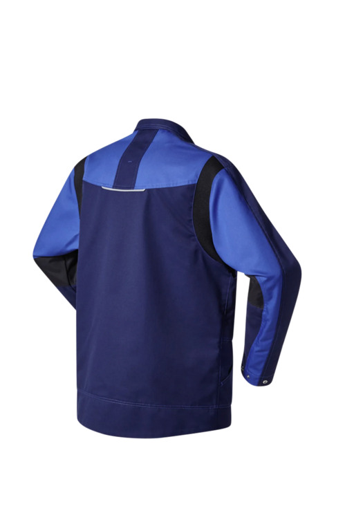 Stehkragen, verlängerter Rücken, verdeckter Reißverschluss und verdeckte Druckknöpfe, ergonomische Schnittführung, Stretcheinsätze im hinteren Schulterbereich, CORDURA®-Verstärkung an den Ellenbogen und an den Brusttaschen, eine linke Brusttasche mit Patte und verdeckten Druckknöpfen, eine rechte aufgesetzte Brusttasche mit Blasebalg, Patte und Stiftfach und oberhalb zusätzliche eingesetzte Reißverschlusstasche, Reflexbiese an linker Taschenpatte und in der Rückenpasse. Seitliche Eingrifftaschen davon eine eingesetzte Tasche mit Blende und verdecktem Druckkopf, eine schräg aufgesetzte Tasche, doppelte Stifttasche auf linkem Oberarm, eine linke Innentasche und verstellbare Ärmelsaumweite durch Druckknöpfe. Leasingtaugliche Verarbeitung. Bundjacke zweifarbig und dreifarbig erhältlich.
