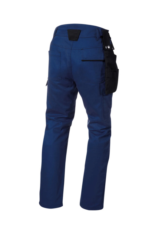 Bundhose mit Knietaschen, zwei eingesetzte Seitentaschen, Zollstocktasche, zwei Gesäßtaschen, rechte mit Patte, eine Cargotasche, Knietaschen, Schlitz mit Metallreißverschluss, Hosenbund mit innenliegendem Knopf verschließbar, Laschen für separate Flexi-Pocket, Kontrastelemente in Schwarz an den Gürtelschlaufen, Innenbund, Tascheneingriffen und den Patten