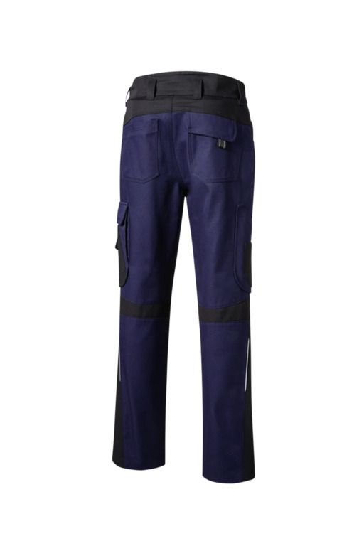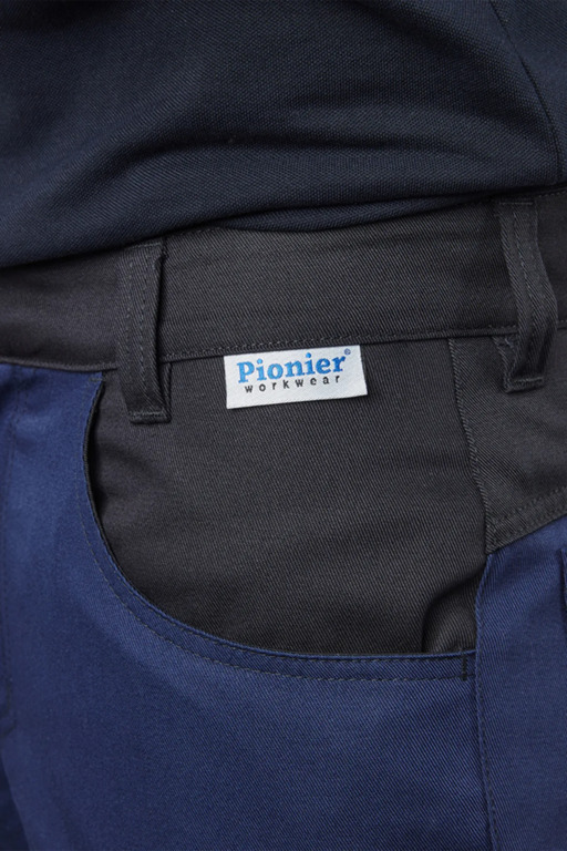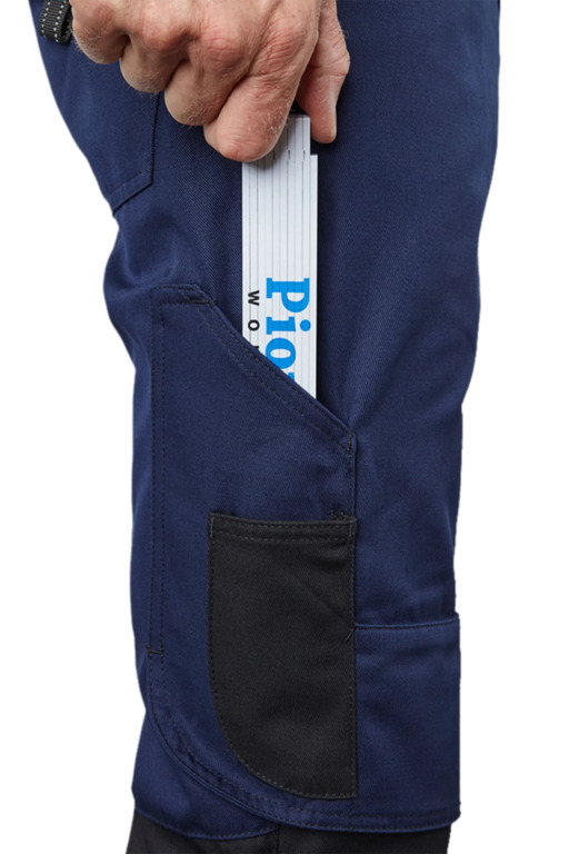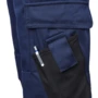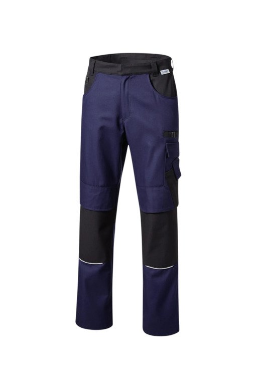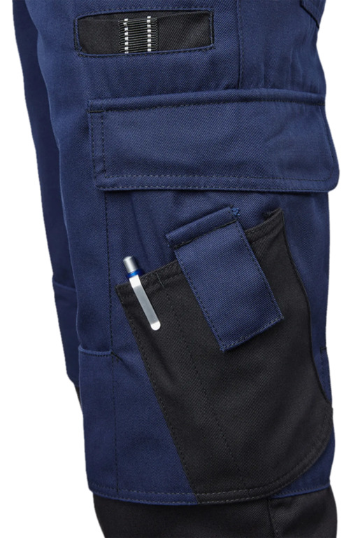 zweifarbige Bundhose mit Stretcheinsatz im Schritt, zwei Seitentaschen davon die Rechte mit einer zusätzlichen kleinen Tasche, Taschenfutter aus Grundgewebe, Hosenschlitz mit Reißverschluss verschließbar, sechs Gürtelschlaufen, eine rechte Zollstocktasche mit einer kleinen aufgesetzten Tasche, eine linke große Cargotasche mit aufgesetzter Handytasche beide mit Druckknopf verschließbar, Zollstocktasche eingesetzt links, aufgesetzte Kniepolstertasche, Reflexpaspel am Hosenbein und am Knie, zwei Gesäßtaschen davon die Rechte mit Patte und Druckknopf verschließbar