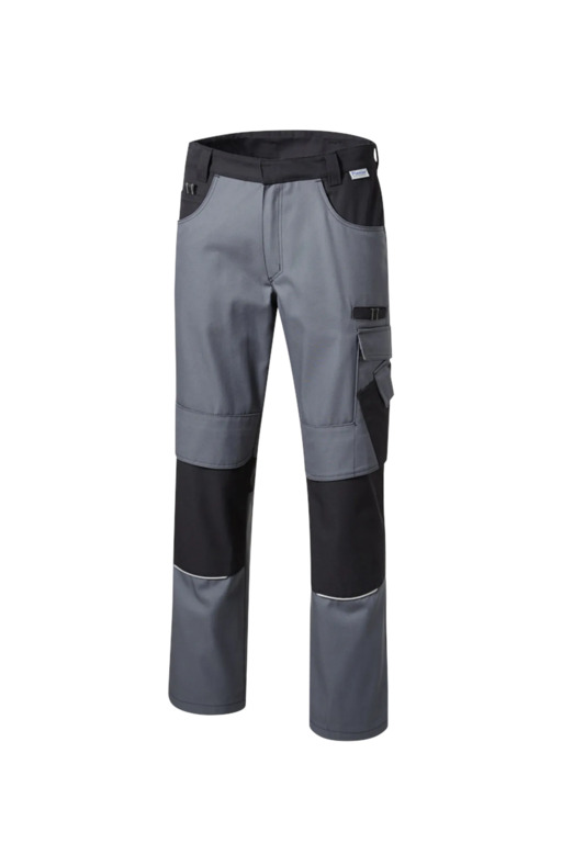 zweifarbige Bundhose mit Stretcheinsatz im Schritt, zwei Seitentaschen davon die Rechte mit einer zusätzlichen kleinen Tasche, Taschenfutter aus Grundgewebe, Hosenschlitz mit Reißverschluss verschließbar, sechs Gürtelschlaufen, eine rechte Zollstocktasche mit einer kleinen aufgesetzten Tasche, eine linke große Cargotasche mit aufgesetzter Handytasche beide mit Druckknopf verschließbar, Zollstocktasche eingesetzt links, aufgesetzte Kniepolstertasche, Reflexpaspel am Hosenbein und am Knie, zwei Gesäßtaschen davon die Rechte mit Patte und Druckknopf verschließbar