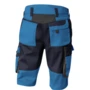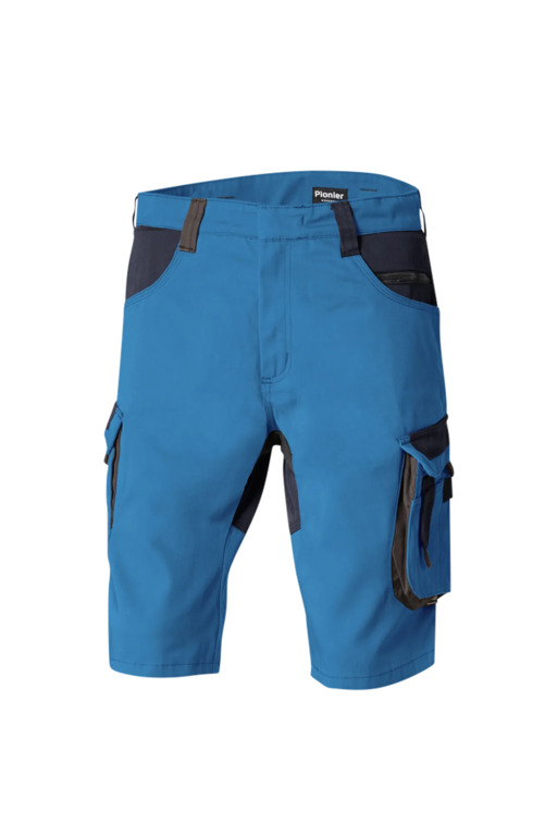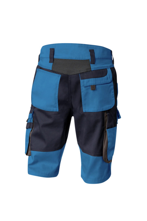 Zweifarbige Shorts mit hochgezogenem Bund, Stretcheinsätze in Schritt und Bund, zwei aufgesetzte Schenkeltaschen mit Blasebalg und Patte, links mit aufgesetzter schräger Handytasche & Stiftfach, Zollstocktaschen rechts und links, Reißverschluss im Schlitz, verdeckter Bundknopf, Reißverschlusstasche oberhalb der linken Eingrifftasche, zwei Gesäßtaschen davon die rechte mit Patte und Klettverschluss, sechs Gürtelschlaufen