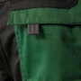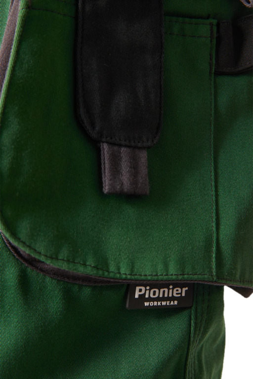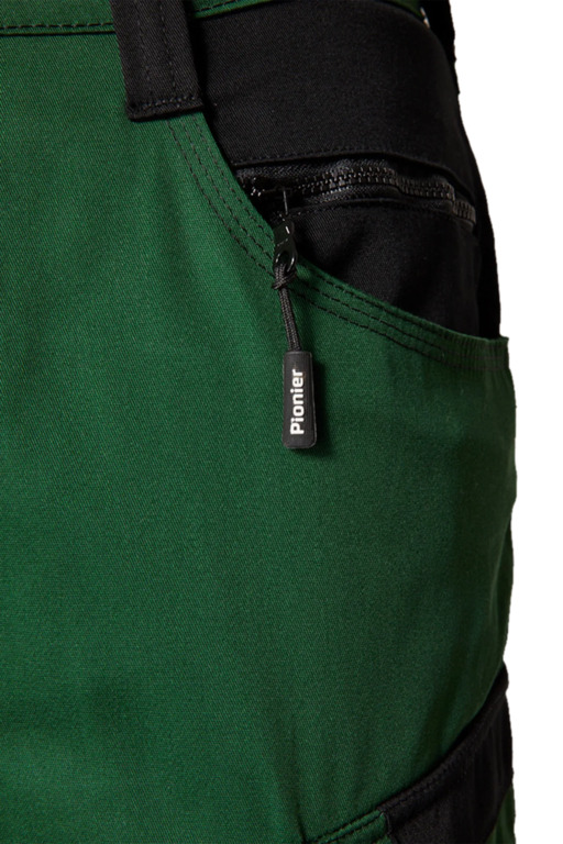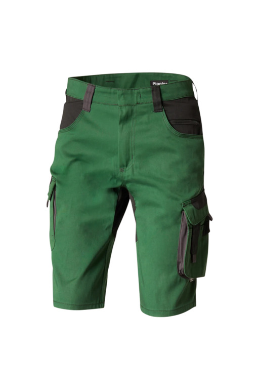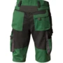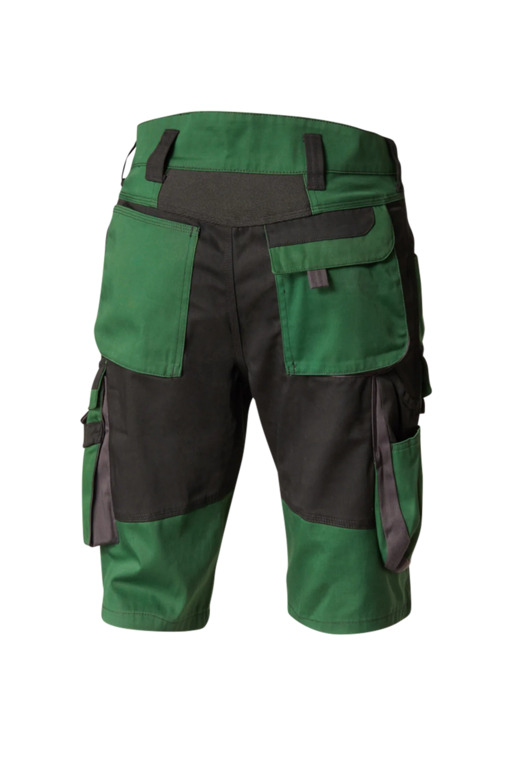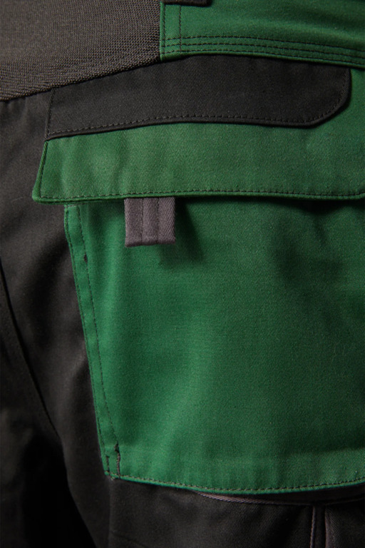 Zweifarbige Shorts mit hochgezogenem Bund, Stretcheinsätze in Schritt und Bund, zwei aufgesetzte Schenkeltaschen mit Blasebalg und Patte, links mit aufgesetzter schräger Handytasche & Stiftfach, Zollstocktaschen rechts und links, Reißverschluss im Schlitz, verdeckter Bundknopf, Reißverschlusstasche oberhalb der linken Eingrifftasche, zwei Gesäßtaschen davon die rechte mit Patte und Klettverschluss, sechs Gürtelschlaufen