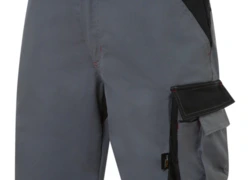 Zweifarbige Shorts mit hochgezogenem Bund, Stretcheinsätze in Schritt und Bund, zwei aufgesetzte Schenkeltaschen mit Blasebalg und Patte, links mit aufgesetzter schräger Handytasche & Stiftfach, Zollstocktaschen rechts und links, Reißverschluss im Schlitz, verdeckter Bundknopf, Reißverschlusstasche oberhalb der linken Eingrifftasche, zwei Gesäßtaschen davon die rechte mit Patte und Klettverschluss, sechs Gürtelschlaufen