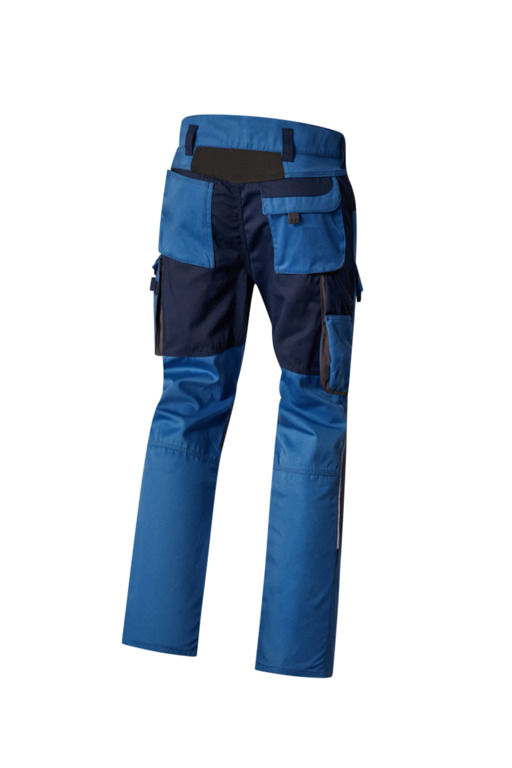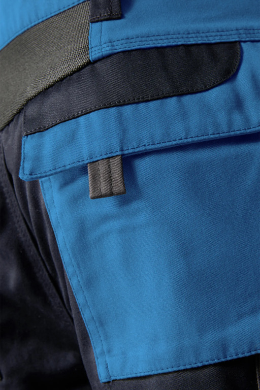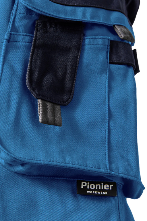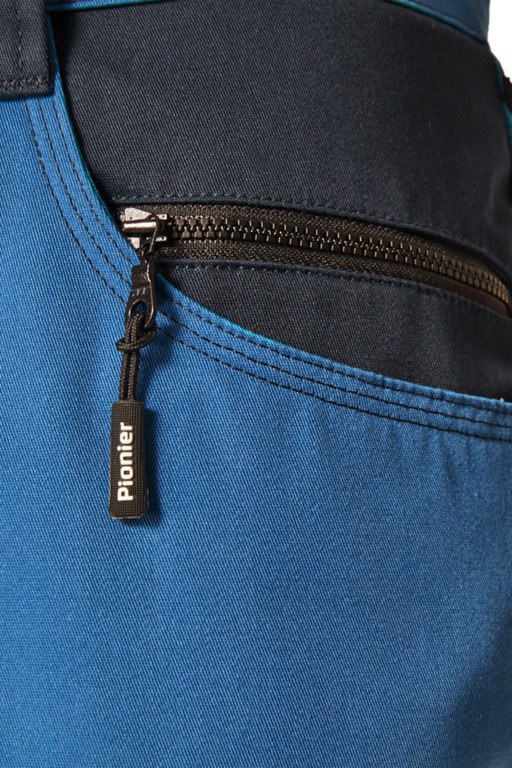 Zweifarbige Bundhose für Damen mit hochgezogenem Bund, Stretcheinsätze in Schritt und Bund, zwei aufgesetzte Schenkeltaschen mit Blasebalg und Patte, links mit aufgesetzter schräger Handytasche & Stiftfach, Zollstocktaschen rechts und links, Reißverschluss im Schlitz, verdeckter Bundknopf, Reißverschlusstasche oberhalb der linken Eingrifftasche, vorgeformte Kniepolstertaschen, kombinierbar mit dem Pionier Kniepolster (W8 90020), zwei Gesäßtaschen davon die rechte mit Patte und Klettverschluss, sechs Gürtelschlaufen, Reflexpaspeln