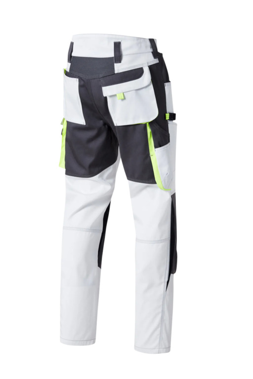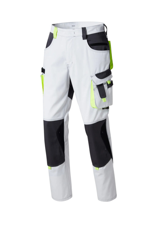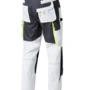 Zweifarbige Bundhose für Damen, mit hochgezogenem Bund, Stretcheinsätze in Schritt und Bund, eine aufgesetzte Schenkeltaschen mit Blasebalg und Patte links, eine Spachteltasche rechts und Karabiner, Zollstocktaschen, alle Taschenpatten mit verdeckten Druckern, Reißverschluss im Schlitz, verdeckter Bundknopf, Reißverschlusstasche oberhalb der linken Eingrifftasche, vorgeformte Kniepolstertaschen, kombinierbar mit dem Pionier Kniepolster (W8 90020), zwei Gesäßtaschen davon die rechte mit Patte und Klettverschluss, Reflexpaspel an den Knien