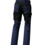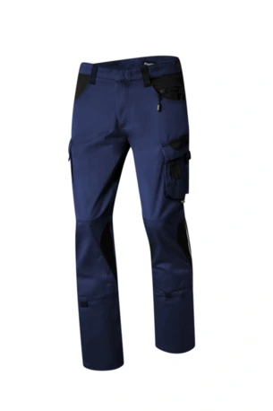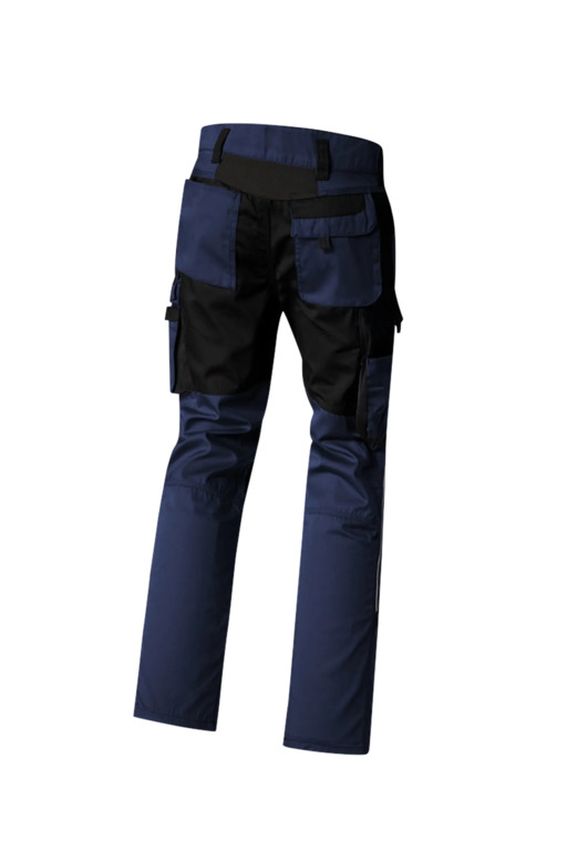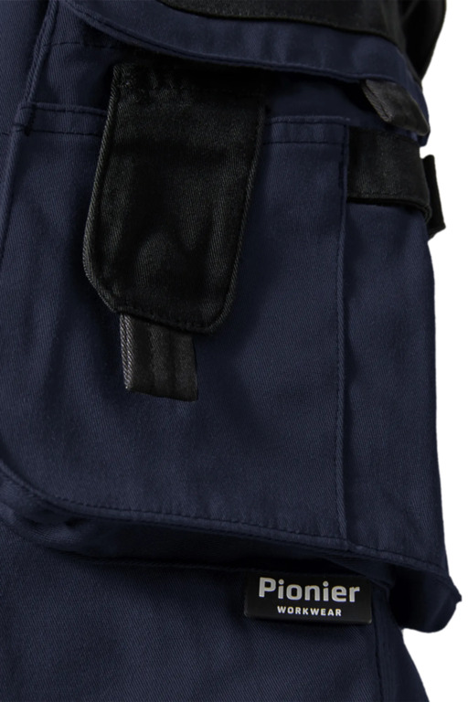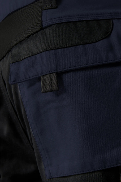 Zweifarbige Bundhose mit hochgezogenem Bund, Stretcheinsätze in Schritt und Bund, zwei aufgesetzte Schenkeltaschen mit Blasebalg und Patte, links mit aufgesetzter schräger Handytasche & Stiftfach, Zollstocktaschen rechts und links, Reißverschluss im Schlitz, verdeckter Bundknopf, Reißverschlusstasche oberhalb der linken Eingrifftasche, vorgeformte Kniepolstertaschen, kombinierbar mit dem Pionier Kniepolster (W8 90020), zwei Gesäßtaschen davon die rechte mit Patte und Klettverschluss, sechs Gürtelschlaufen, Reflexpaspeln