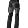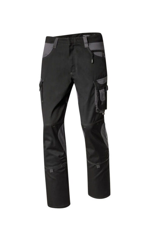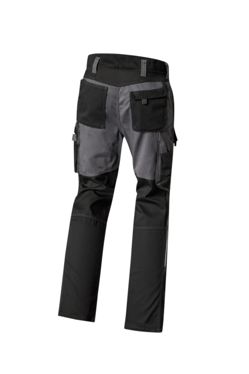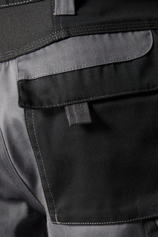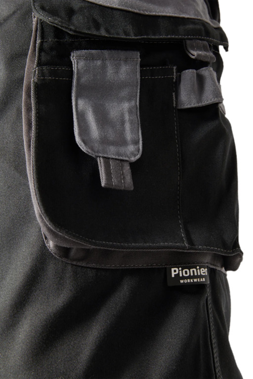 Zweifarbige Bundhose mit hochgezogenem Bund, Stretcheinsätze in Schritt und Bund, zwei aufgesetzte Schenkeltaschen mit Blasebalg und Patte, links mit aufgesetzter schräger Handytasche & Stiftfach, Zollstocktaschen rechts und links, Reißverschluss im Schlitz, verdeckter Bundknopf, Reißverschlusstasche oberhalb der linken Eingrifftasche, vorgeformte Kniepolstertaschen, kombinierbar mit dem Pionier Kniepolster (W8 90020), zwei Gesäßtaschen davon die rechte mit Patte und Klettverschluss, sechs Gürtelschlaufen, Reflexpaspeln