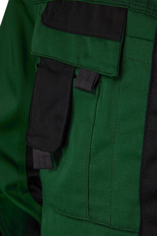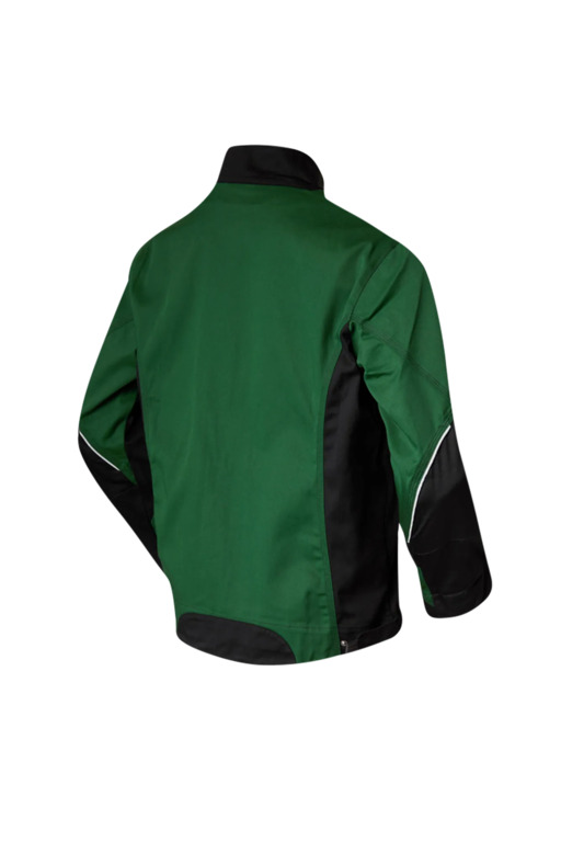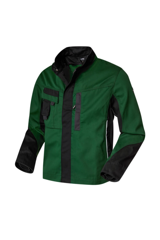 Leasingtaugliche zweifarbige Bundjacke, Stehkragen, verdeckter Reißverschluss, zwei eingesetzte Seitentaschen mit verdecktem Reißverschluss, Innentasche, eine innenliegende eingesetzte Brusttasche mit verdecktem Reißverschluss, eine aufgesetzte Blasebalg-Brusttasche mit Patte, Stifttasche, aufgesetzte Handytasche auf der rechten Brusttasche, extra langer Rücken, innenliegende Ärmelstrickbündchen, innenliegende Druckknöpfe zum Einknöpfen einer Innenweste, Bundweitenverstellung durch Druckknopflasche, Reflexpaspel vorne und an den Ellenbogen