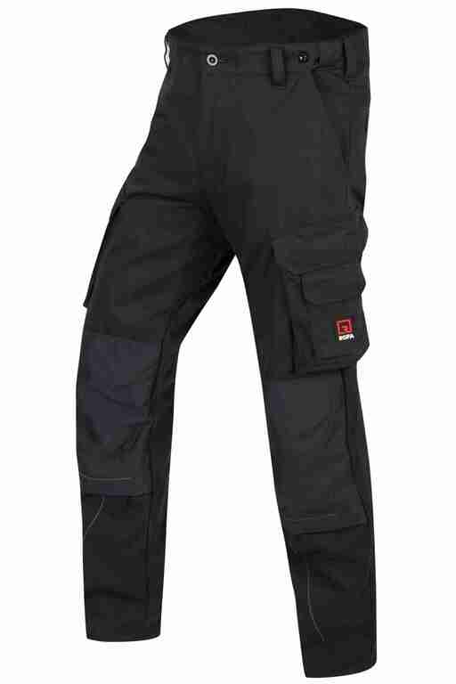 Dehnbund mit Feststellmöglichkeit, Bund mit Gürtelschlaufen und Knopf, Schlitz mit Reißverschluss, 2 Seitentaschen, links Cargotasche mit zusätzlich aufgesetzter Tasche jeweils mit Patte und Klett sowie integrierter Stifttasche, rechts Cargotasche mit Patte und Klett und integrierter Zollstocktasche, zusätzlich aufgesetzte Tasche, Knietaschen aus Cordura, 2 Gesäßtaschen, Gesäßtasche rechts mit Patte und Klett, Reflexpaspeln an den Beinen.