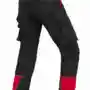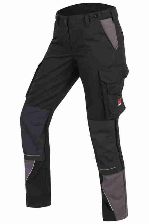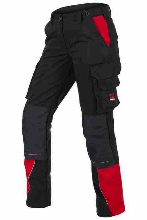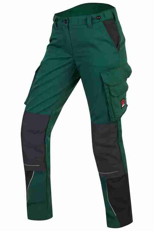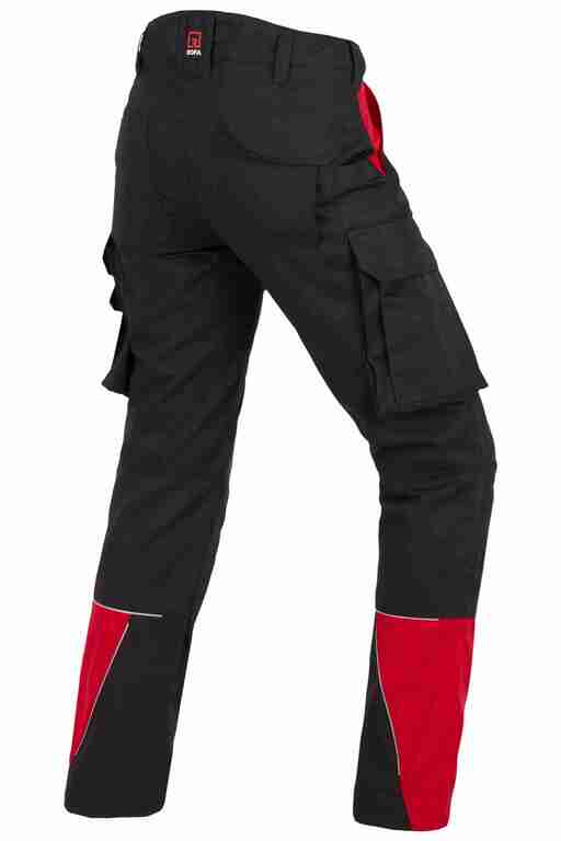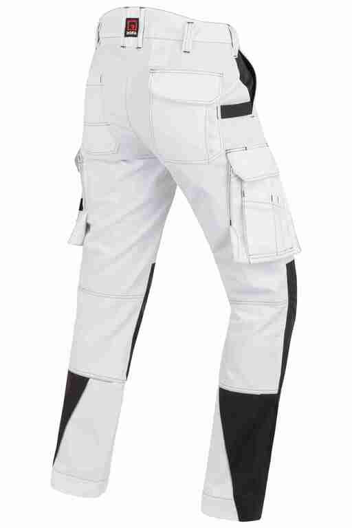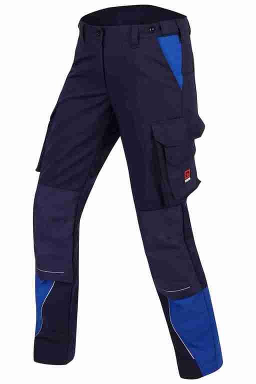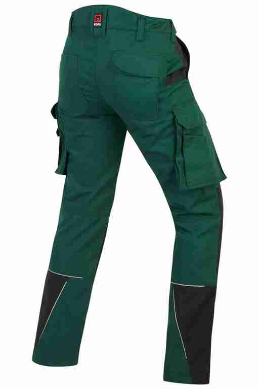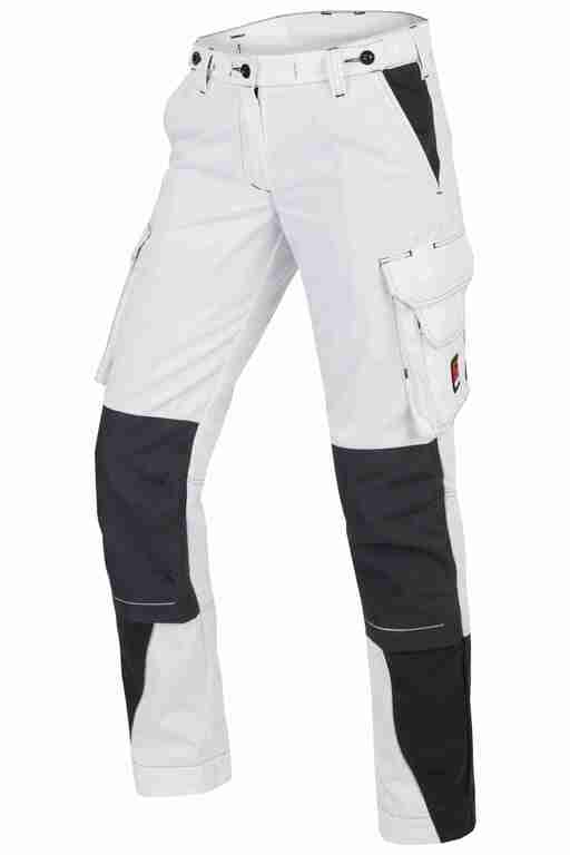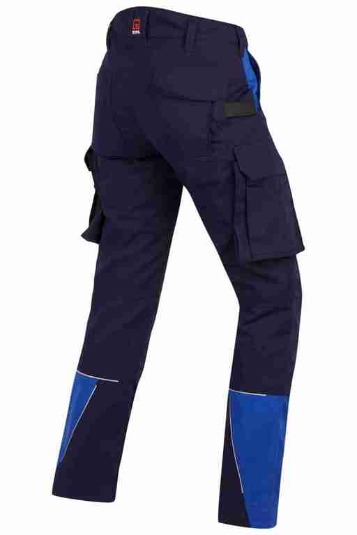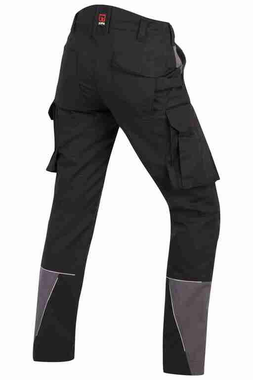 Dehnbund mit Feststellmöglichkeit, Bund mit Gürtelschlaufen und Knopf, Schlitz mit Reißverschluss, 2 Seitentaschen, links Cargotasche mit zusätzlich aufgesetzter Tasche jeweils mit Patte und Klett sowie integrierter Stifttasche, rechts Cargotasche mit Patte und Klett und integrierter Zollstocktasche, zusätzlich aufgesetzte Tasche, Knietaschen aus Cordura, 2 Gesäßtaschen, Gesäßtasche rechts mit Patte und Klett, Reflexpaspeln an den Beinen, Skandinavischer Saum.