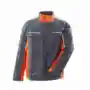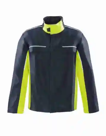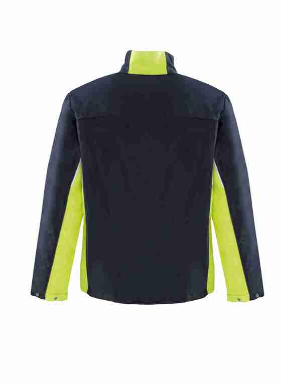 Stehkragen, vordere Mitte mit Druckknöpfen, 2 Brusttaschen mit Patte und Druckknopf, Ärmelabschluss weitenverstellbar durch Druckknöpfe, 2 Brustinnentaschen, Reflexpaspel an Rumpf und Ärmeln, Reflexpaspel auf Schultern.