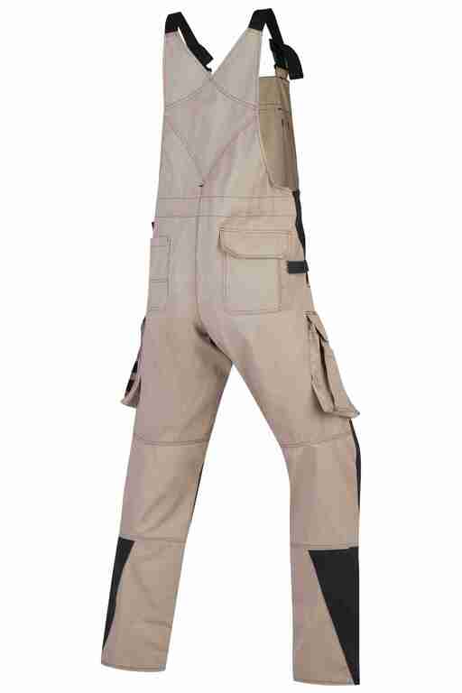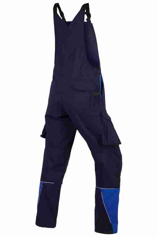 Stretchträger, Latztasche mit Patte und Klett sowie 2 abgenähten Stifttaschen, Schlitz mit Reißverschluss, Bund seitlich mit Dehneinsatz, 2 Seitentaschen, links Cargotasche mit zusätzlich aufgesetzter Tasche jeweils mit Patte und Klett sowie integrierter Stifttasche, rechts Cargotasche mit Patte und Klett und integrierter Zollstocktasche, zusätzlich aufgesetzte Tasche mit Unterteilungen, Knietaschen aus Cordura, 2 Gesäßtaschen, Gesäßtasche rechts mit Patte und Klett, Reflexpaspeln an den Beinen.