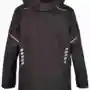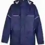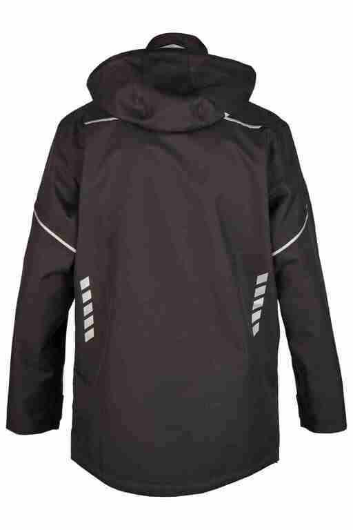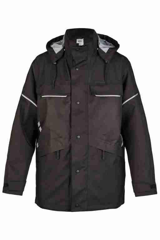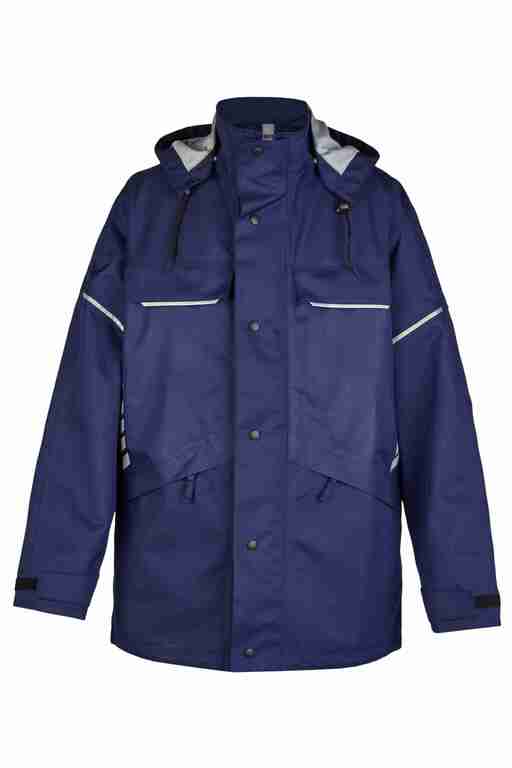 Stehkragen mit abnehmbarer Kapuze, vordere Mitte mit Zwei-Wege-Reißverschluss, vordere Leiste mit Druckknöpfen und Regenablaufrinne, 2 Brusttaschen mit Patte und Klett, Ärmelabschluss weitenverstellbar durch Riegel mit Klett, 2 Seitentaschen mit Reißverschluss, links Napoleontasche mit Reißverschluss, 2 Innentaschen mit Klett, Reflexapplikationen an Rumpf, Reflexpaspel an Ärmel, Vorderteil- und Rückenteilpasse.