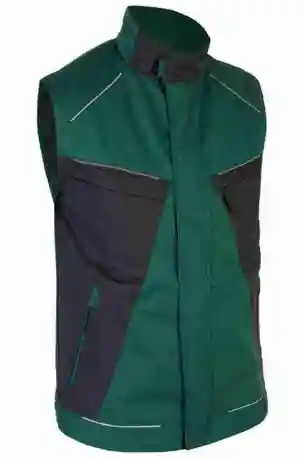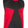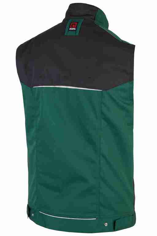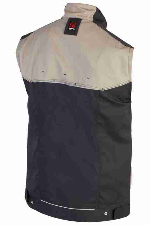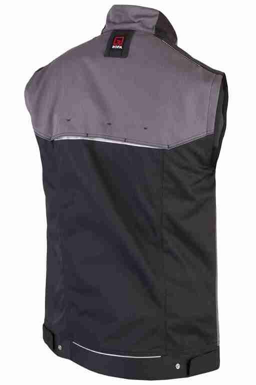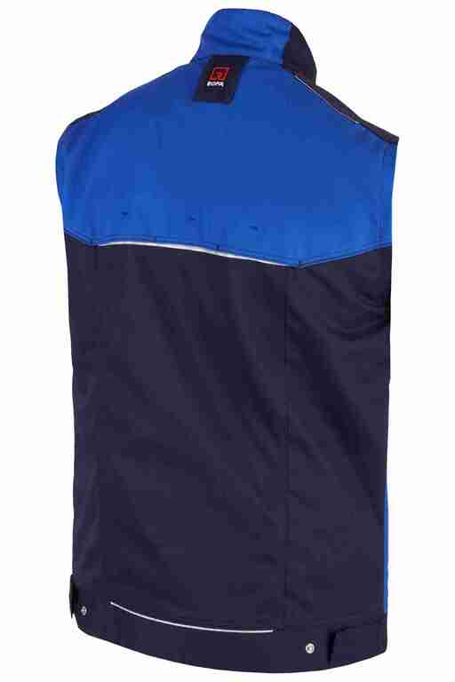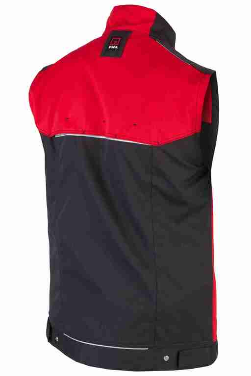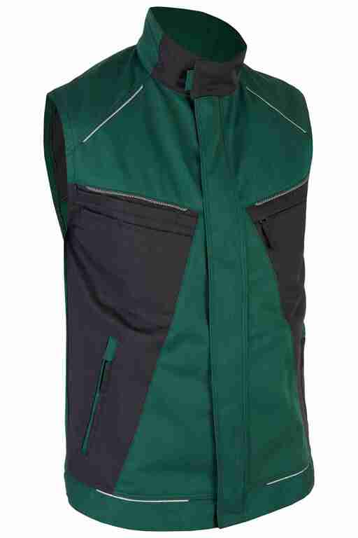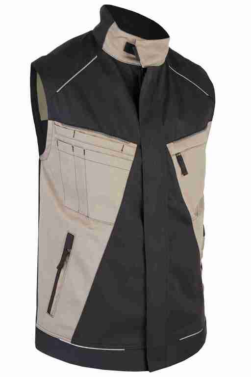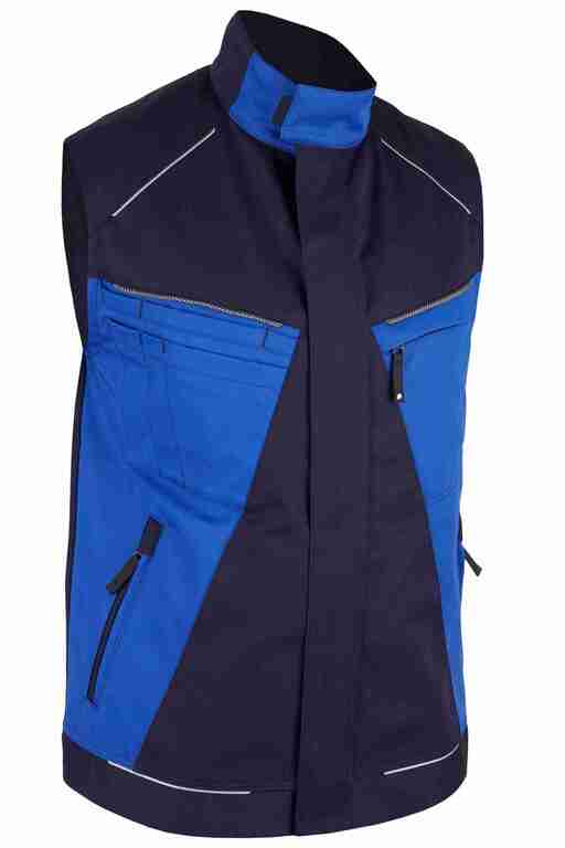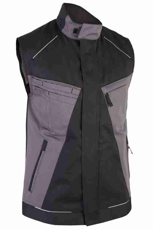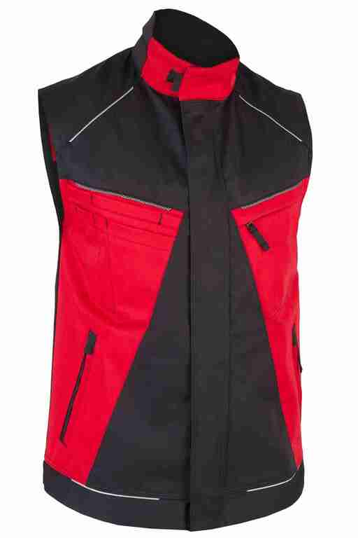 Variabler Bikerkragen als Stehkragen oder Umlegekragen, vordere Mitte mit Reißverschluss, vordere Leiste mit Klett, 2 Brusttaschen, Brusttasche links mit Reißverschluss, rechts mit abgenähter Stifttasche und zusätzlich aufgesetzte Tasche mit Unterteilungen, 2 Seitentaschen mit Reißverschluss, Rückenkoller mit Belüftungsöffnungen, 2 große Innentaschen, Reflexpaspeln an Rumpf.